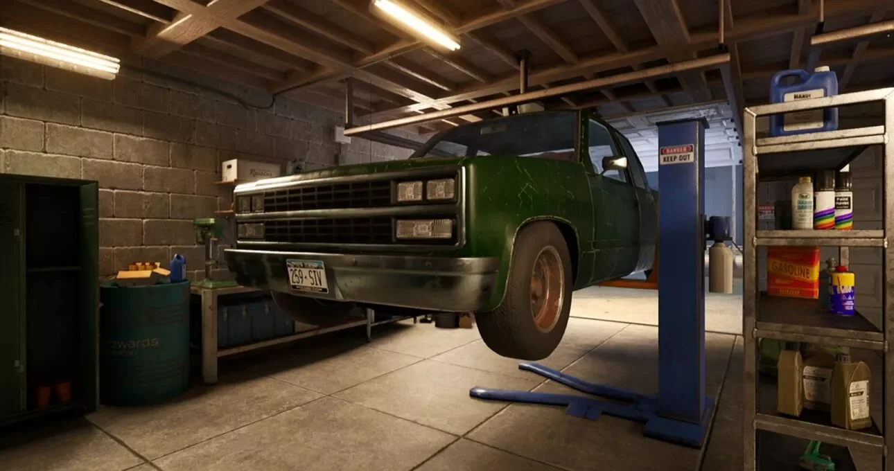 The visuals are grounded and believable. This isn’t a high-budget production, but every texture and prop feels hand-placed to create realism. The dull gleam of the tile floor under fluorescent lights, the dusty corners of the workshop, and the oil-slick reflections outside all build a sense of place.