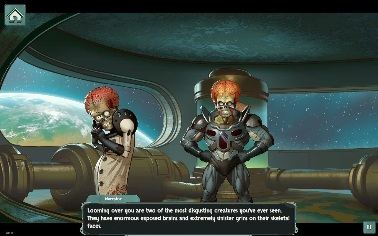 When I received my copy of the game, the developers over at Outlier suggested clicking on a Martian behind the game’s logo in the upper left corner of the Main Menu to, and I quote, “see some true Martian Attraction!” Not one to turn down such a request, I obliged. As a result, I was taken to what I can only describe as a visual novel-style mini-game where I was a character that was abducted by the Martians and I was given interactive dialogue choices to converse with the Martian Scientist, the Martian Commander, and… part of another human, named XXX. If you have watched Mars Attacks, you can probably guess where this is going. If not, sorry, but I won't be spoiling the fun here! With so many different dialogue choices and outcomes, I ran through it multiple times to try and get to a “Good Ending.” It was very reminiscent of the Choose Your Own Adventure-style books I used to read as a kid, particularly the Goosebumps versions if anyone else remembers those. After experiencing my fill, I was eager to jump into the core game.