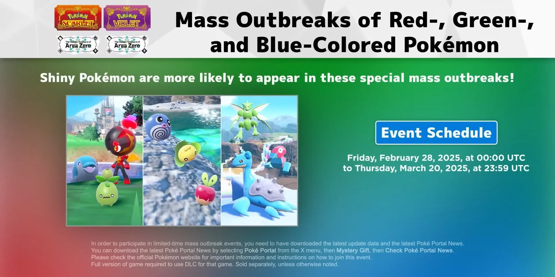 The latest mainline entry, Pokémon Scarlet and Violet, also get a number of minor updates to celebrate Pokémon Day. Starting with a code players can enter in-game to receive a special case for their Rotom Phone, it’s followed by the bigger announcement of Red-, Green-, and Blue-Coloured Pokémon Mass Outbreaks that will feature higher chances of encountering Shiny Pokémon from February 28th to March 20th. Every week, the final evolutions of the starter trio will appear in Tera Raids for players to catch starting tomorrow, with more Tera Raids planned for the future.
